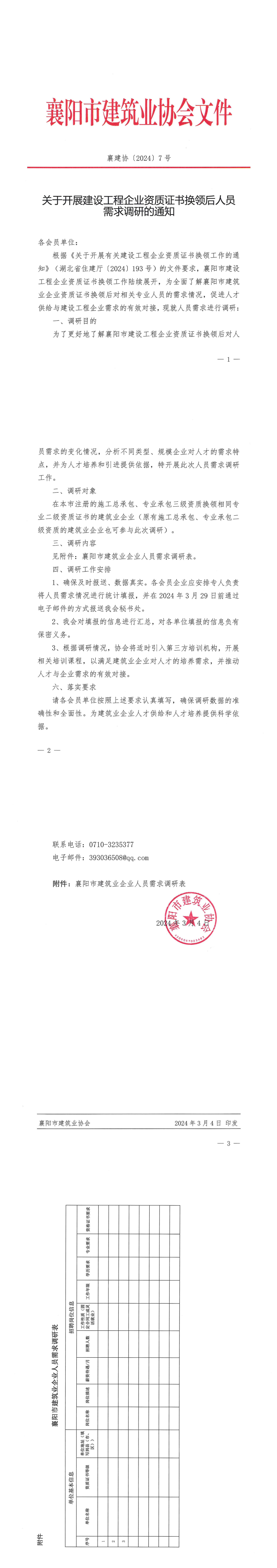 見附件:襄陽市建筑業企業人員需求調研表。