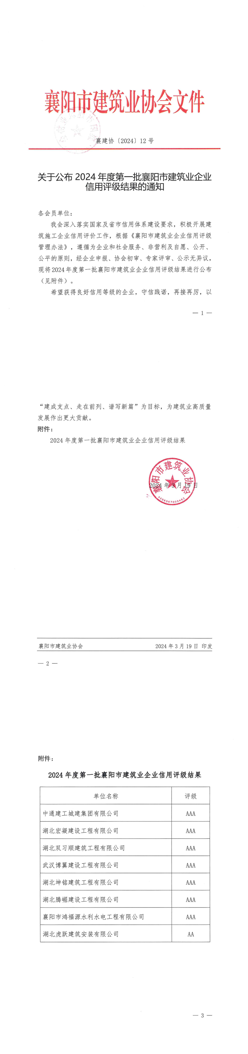 襄建協〔2024〕12號關于公布2024年度第一批襄陽市建筑業企業信用評級結果的通知