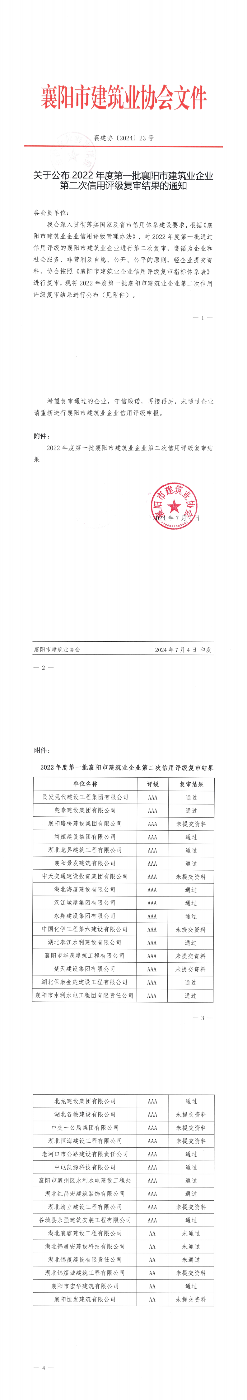 關(guān)于公布2022年度第一批襄陽市建筑業(yè)企業(yè)第二次信用評級復審結(jié)果的通知